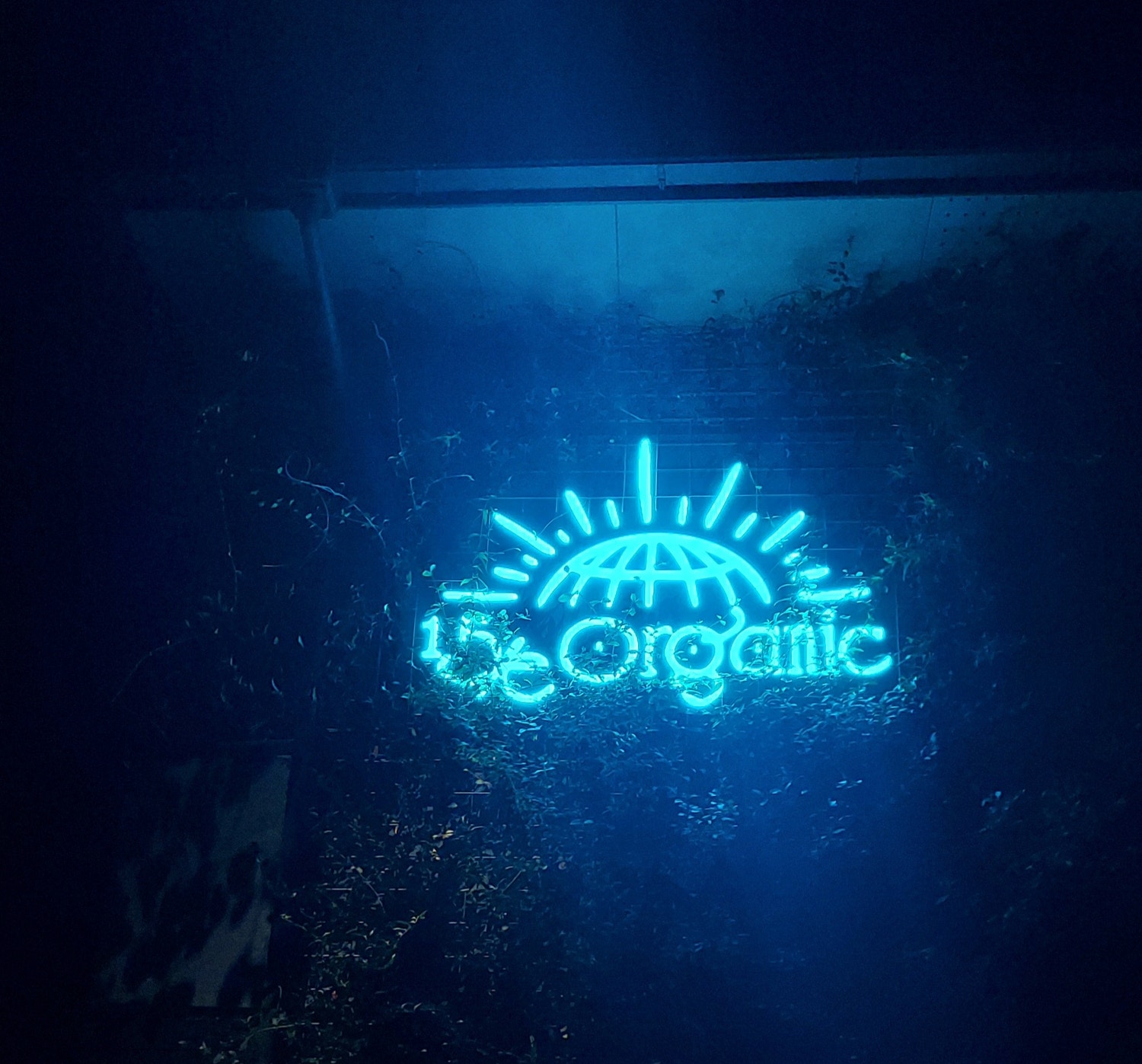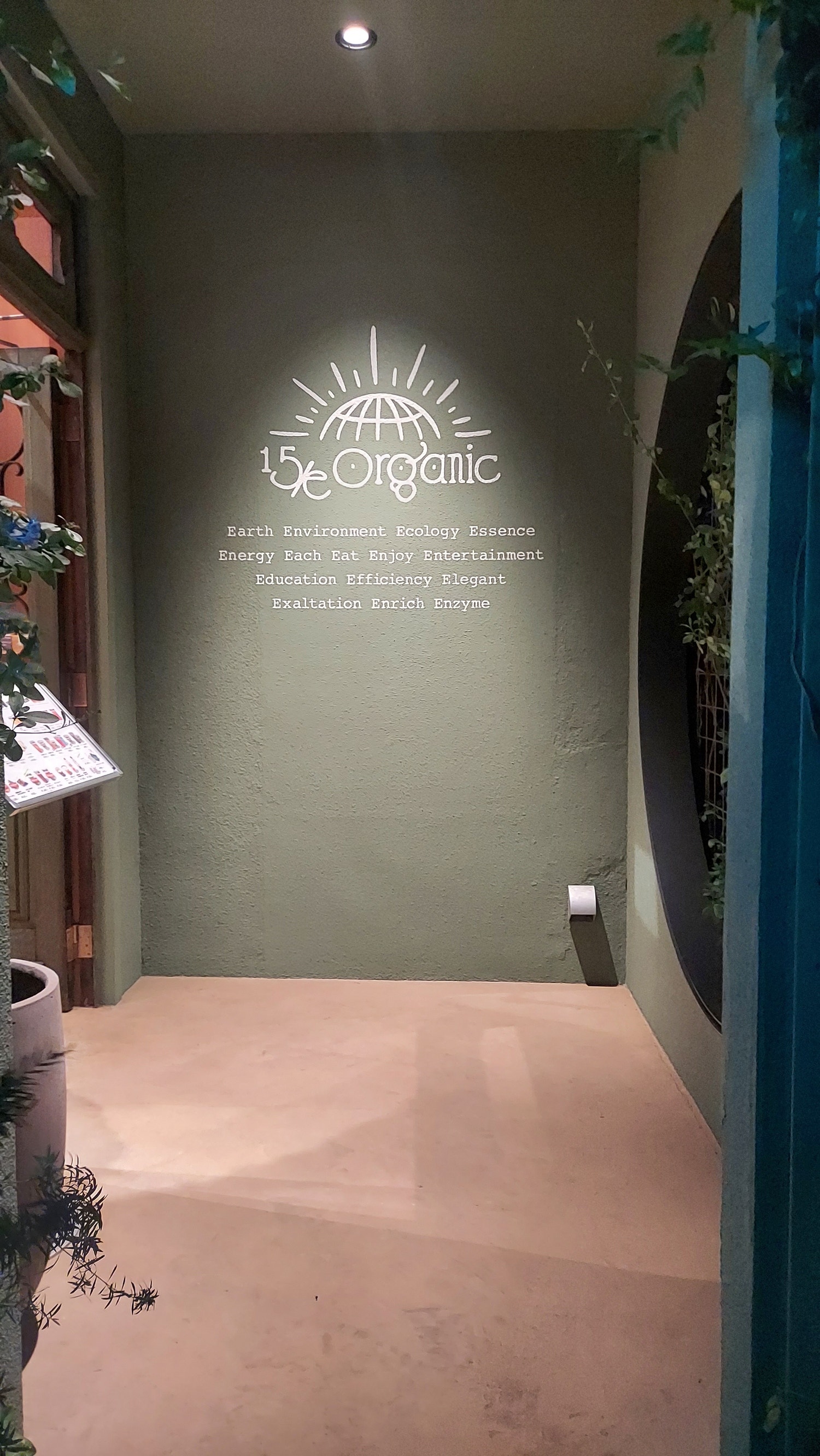 夜の高級住宅街に浮かび上がる15/e organicの文字💚